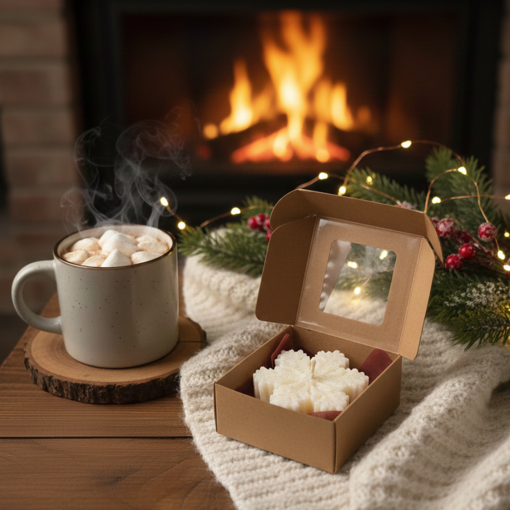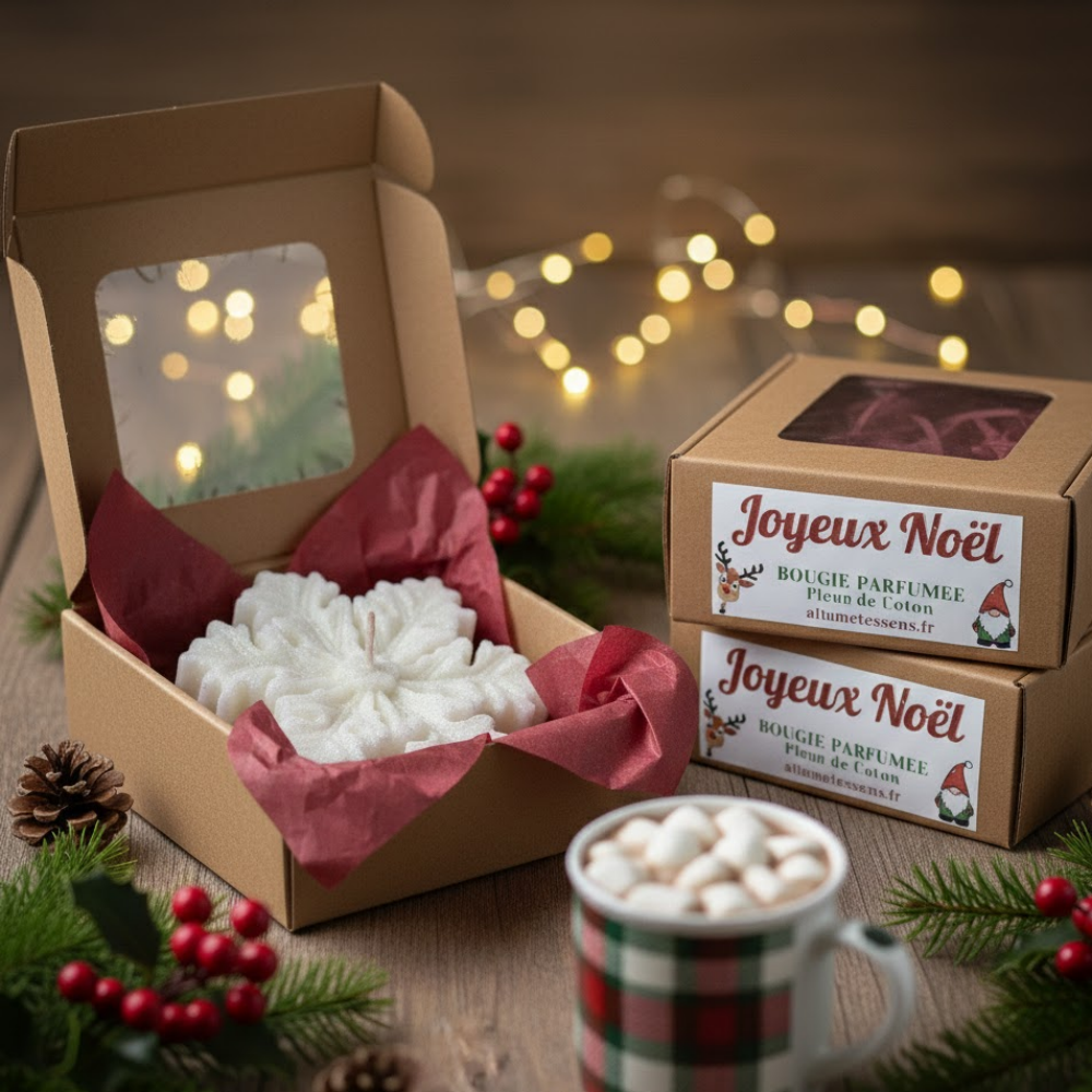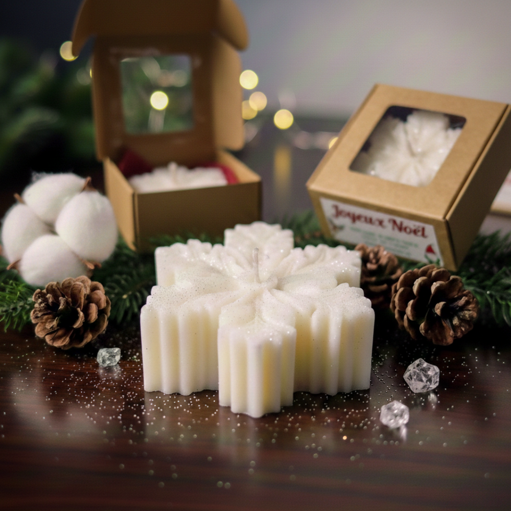 « Un flocon de cire délicat au parfum pur de fleur de coton, emballé avec soin pour illuminer vos petites attentions de Noël. »